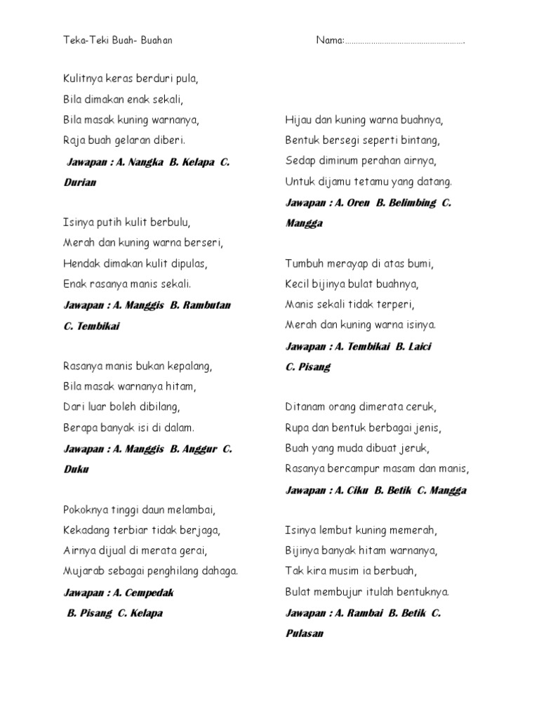 Himpunan Contoh Teka Teki Buah Buahan Dan Jawapan Yang Berguna Untuk Ibubapa Contoh Resume Cover Letter Curriculum Vitae Terbaik